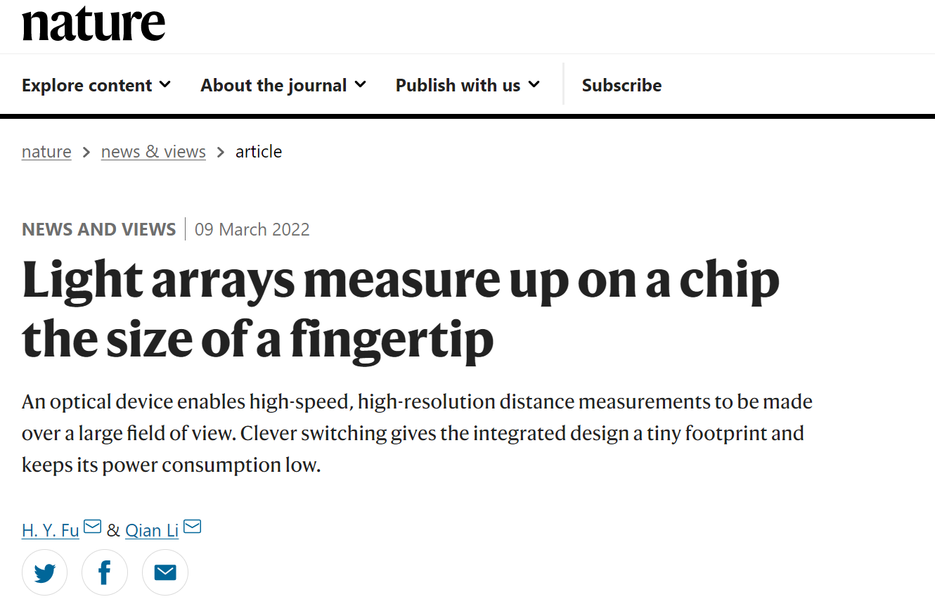 该评述文章近日以“在指尖大小芯片上进行的光阵列测量”(Light arrays measure up on a chip the size of a fingertip)为题发表于3月10日《自然》(Nature)期刊上的研究专栏(DOI: //doi.org/10.1038/d41586-022-00642-1), 论文作者为清华大学深圳国际研究生院清华-伯克利深圳High漫