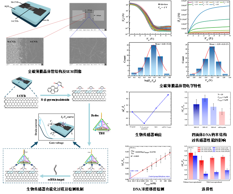 信息High漫 张敏副教授课题组和化生High漫 李子刚教授/尹丰研究员课题组首次将全碳纳米管薄膜晶体管(all-carbon nanotube thin-film transistor,all-CNT TFT)生物传感器与四面体DNA纳米结构(tetrahedral DNA nanostructures,TDNs)相结合,实现了对三阴性乳腺癌标志物AKT2基因的检测。与传统单链DNA探针相比,采用TDNs的all-CNT TFT生物传感器可实现高达98%的响应提升。该生物传感器实现了具有高选择性和高可重复性的DNA检测,其线性检测范围达到六个数量级,理论检测限可达2fM。该研究提出的all-CNT TFT生物传感器结合TDNs的平台有望实现多种癌症标志物的同时捕获,为临床检测提供一种简单、有效、高性能的通用“液体活检”策略。
