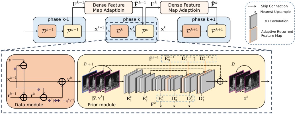 “Dense Deep Unfolding Network with 3D-CNN Prior for Snapshot Compressive Sensing”研究的内容是可解释性网络在视频压缩感知上的应用。视频压缩感知被广泛地应用在成像系统上,其目的是利用二维传感器来捕捉诸如视频亦或是光谱等高维信号。通过在成像系统中引入额外的硬件部件,高维信号被压缩成二维信号,随后运用重建算法完成二维信号到高维信号的重建,通过此类硬件加软件的形式,能够减少数据的存储空间和传输带宽。然而,现有的方法均存在一定的局限性,基于模型的方法需要迭代多次才能收敛,在速度上无法满足实时性,基于网络的方法又缺乏一定的可解释性,High漫张健教授课题组的研究表明,基于深度展开的方法能够很好地利用两种方法的优势。该研究结果所设计的深度展开网络由优化压缩感知的半二次分裂算法(HQS)展开而成,深度展开网络的网络结构由数据模块和先验模块交替堆叠而成,其中引入3D卷积来提升深度展开网络对帧间相关性的表征能力;以及使用稠密特征融合技术减少信息在不同阶段之间传递引起的损失,以及帮助信息自适应地在不同阶段中传输。网络结构如下图所示: