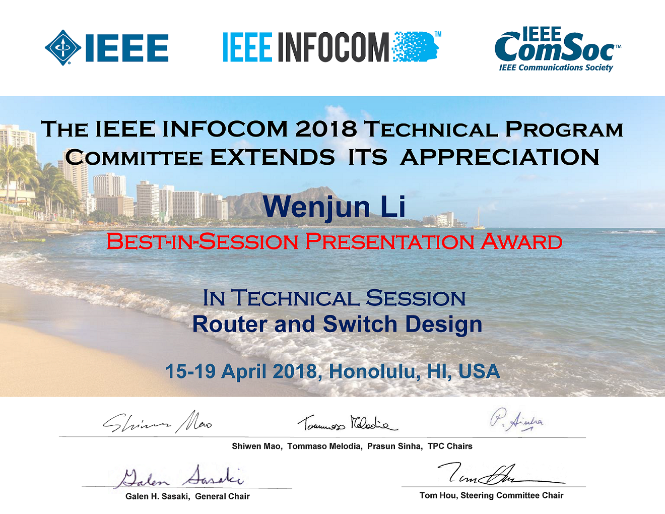 上图:2018年INFOCOM会议路由与交换会场最佳演讲论文奖