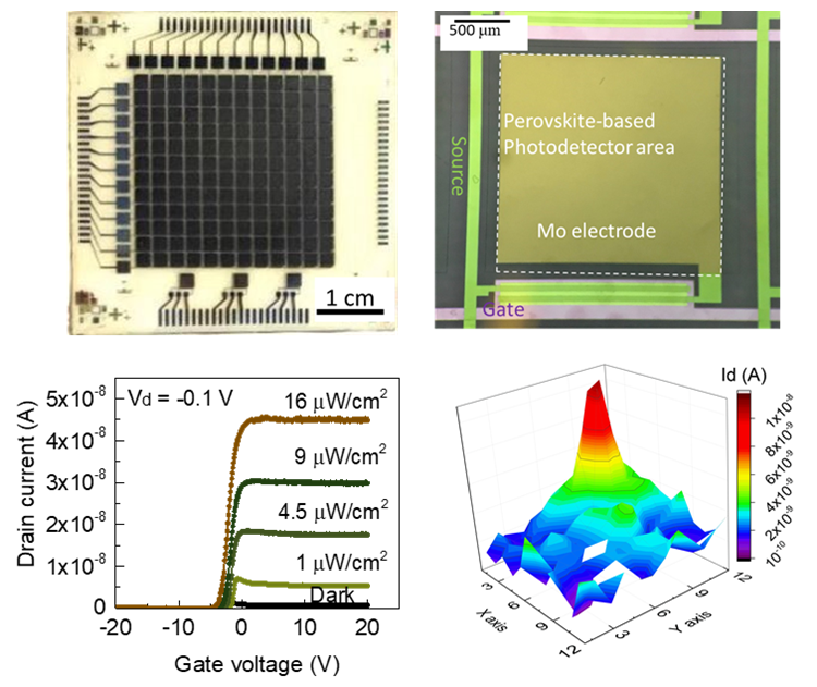 图. IGZO TFT/钙钛矿二极管阵列(左上),IGZO TFT/钙钛矿二极管成像像素结构(右上),