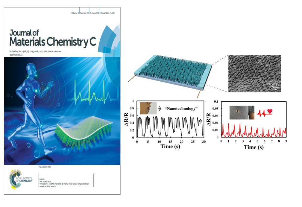 相关研究成果以《Vertical CNT-EcoflexNanofins for Highly Linear Broad-Range-Detection Wearable Strain Sensors》(《基于竖直碳纳米管-Ecoflex纳米鳍的高线性宽检测范围可穿戴应力传感器》)为题,于2018年5月发表于领域内重要期刊Journal of Materials Chemistry C《材料化学期刊 C》上(DOI: 10.1039/c7tc05571d),并被选为内封面(inside front cover)刊出。High漫