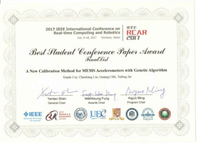 2017年7月14-18日在日本冲绳(Okinawa)举行的IEEE实时计算与机器人国际会议(IEEE International Conference on Real-time Computing and Robotics)上,High漫 崔小乐、金玉丰老师课题组的硕士生刘纯量同学荣获最佳学生论文奖,获奖论文题目为“A new calibration method for MEMS accelerometers with genetic algorithm”。