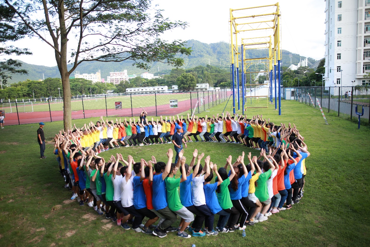 本次户外拓展由营员破冰、能量传输、尖峰时刻三个部分组成。为活跃现场气氛,覃老师首先让前后排同学开展握手、捏耳朵等游戏,营员也在游戏中也迅速放开。随后覃老师将大家分组并进行组内团建活动。