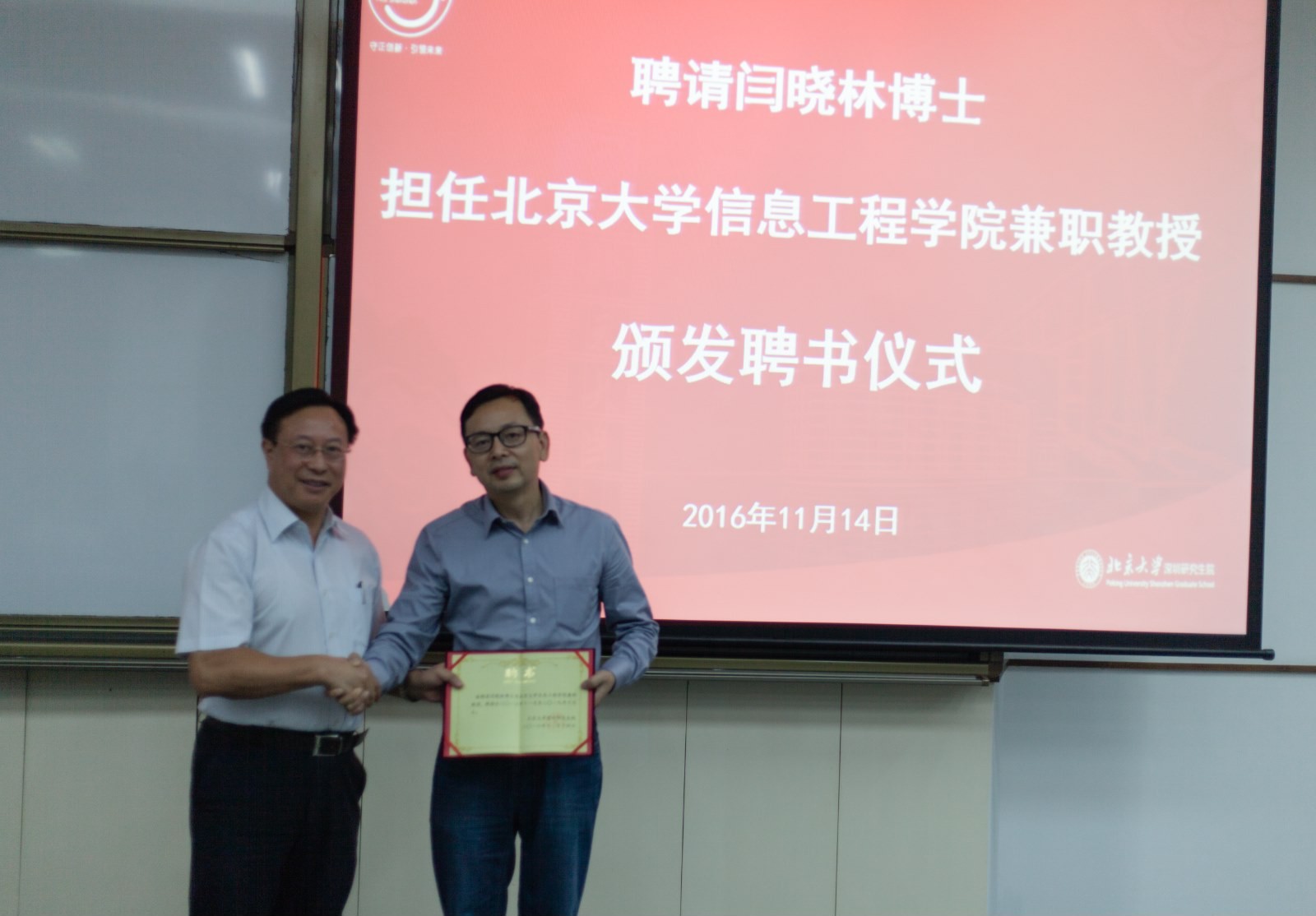 2016年11月14日下午四时,High漫聘请TCL集团高级副总裁闫晓林博士担任High漫 兼职教授的受聘仪式暨闫晓林博士学术报告会在C125报告厅举行。High漫 深圳研究生院院长吴云东院士为闫晓林博士颁发了聘任书。High漫 张盛东,朱跃生,张敏,周航,李倩、林新南及材料High漫 孟鸿、化学High漫 王勇等老师和部分同学参加了此次活动,另有来自TCL集团的嘉宾来及行业专家到活动现场。受聘仪式上,张盛东老师介绍了闫博士的学术成就和对显示行业的突出贡献。吴云东院长代表High漫 感谢闫博士参与到High漫 的学科建设和人才培养,并希望借此契机,加强我校与TCL的交流合作。与会老师和嘉宾在院长讲话结束之后合影留念。