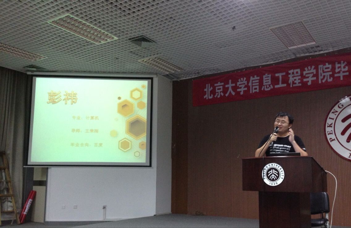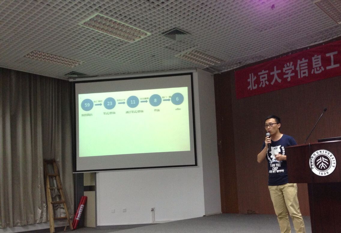对就业与深造经验交流工作的支持,也感谢了几位师兄的倾力加盟,之后宣布交流会正式开始。第一位进行经验介绍的是来自刘宏教授实验室的张结同学。张结同学有着丰富的博士申请经验,曾成功获得荷兰代尔夫特大学、英国帝国理工大学等攻读博士学位的机会,他主要为同学们介绍了留学所需要准备的材料,还与同学们分享了准备留学与学校选择时的心路历程,他最终选择到代尔夫特大学攻读博士学位。第二位进行经验介绍的是来自王新安教授实验室的杨乐同学。杨乐同学的演讲主题是“选择与就业”,他告诉我们一种选择决定一种生活,要遵循内心的声音。接下来演讲的是计算机专业的彭祎同学。彭祎同学的毕业去向是百度,他的演讲方式轻松幽默,让在场的同学获得了非常愉悦的听觉体验。随后,来自微电子专业的岳仑仑同学的毕业去向是华为,他以自己求职面试的亲身经历给大家提出了一些自己的求职小建议。第五位进行经验介绍的是来自计算机专业的陈艺勇同学。陈艺勇同学有着丰富的互联网公司求职经验,曾成功获得阿里巴巴、WAP、宜信等公司的入职机会,最终根据自己个人情况选择了宜信大数据方向的工作。接下来演讲的是微电子专业的杜虓同学,他的毕业去向是东方证券,他以自己的亲身经历告诉我们换专业并不难,我们信工的学生同样可以从事金融证券方面的工作。随后,来自计算机专业的李旭峰同学为大家讲述了自己应聘央行的经历,并分享了一些国企、央企、事业单位的求职经验。最后一位是来自张盛东教授实验室的谢磊同学,他从简历制作到面试笔试都为同学们做了细致的分析与经验分享。
