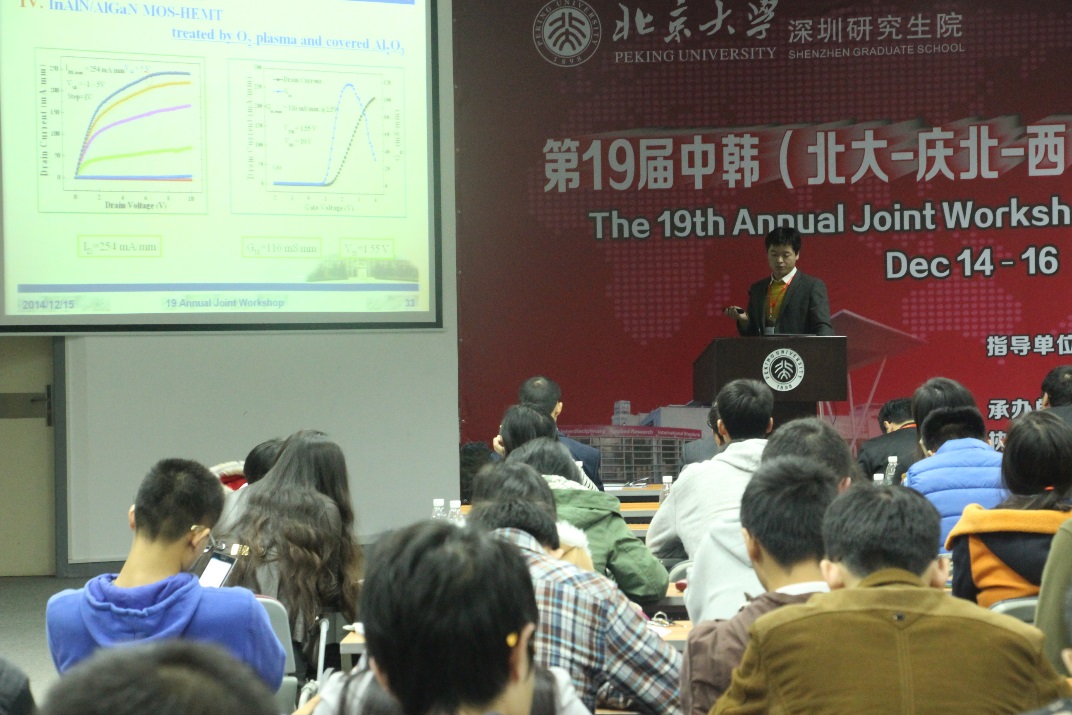 副院长张盛东教授致欢迎辞。来自三个学校的3位教授分别做了大会主题报告。庆北大学的Hongsik Park教授做了低维材料生长精准控制的专题报告,介绍了其研究小组在碳纳米管及石墨烯材料制备领域的研究思路和相关进展;西安电子科技大学的薛军帅博士做了其研究小组在III-V族化合物半导体器件研究方面的最新研究进展报告;最后,我High漫