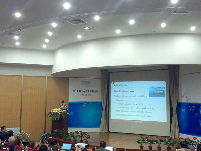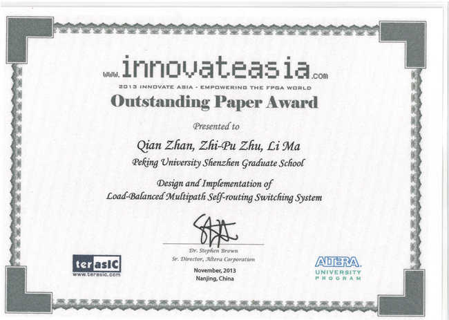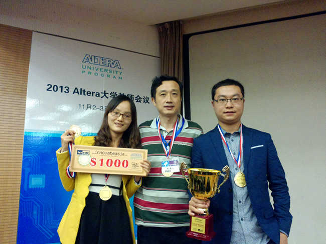 会上还进行了“2013年 Altera 亚洲创新设计大赛”的颁奖仪式。由李挥教授指导的詹谦、朱鸷璞、马丽设计的作品《负载均衡型多路径自路由交换系统的FPGA设计》勇夺本届大赛特等奖。同时,其团队投稿的名为《Design and Implementation of Load-Balanced Multipath Self-routing Switching System》的论文获得优秀文稿奖。