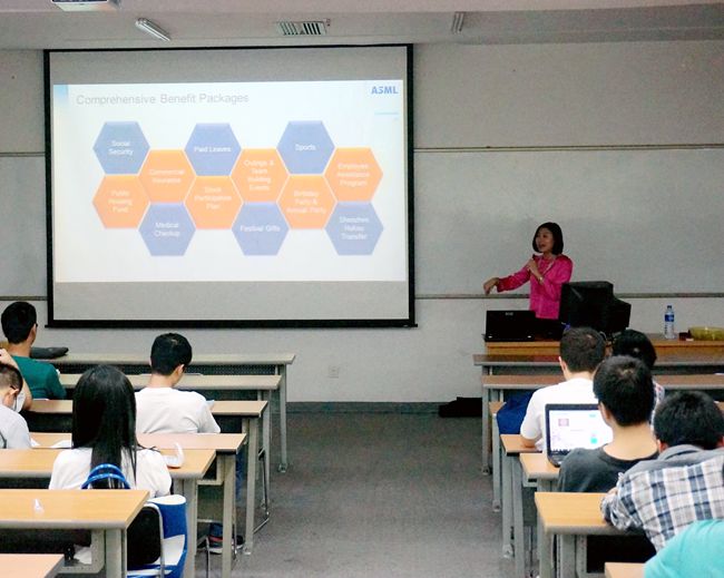 阿斯麦-睿初科技的人力资源负责人Hebe向大家介绍了阿斯麦-睿初科技的薪酬福利、工作环境、职业发展通道等大家非常关心的问题。之后,宣讲会进入提问环节,同学们踊跃提问,场面非常热烈。