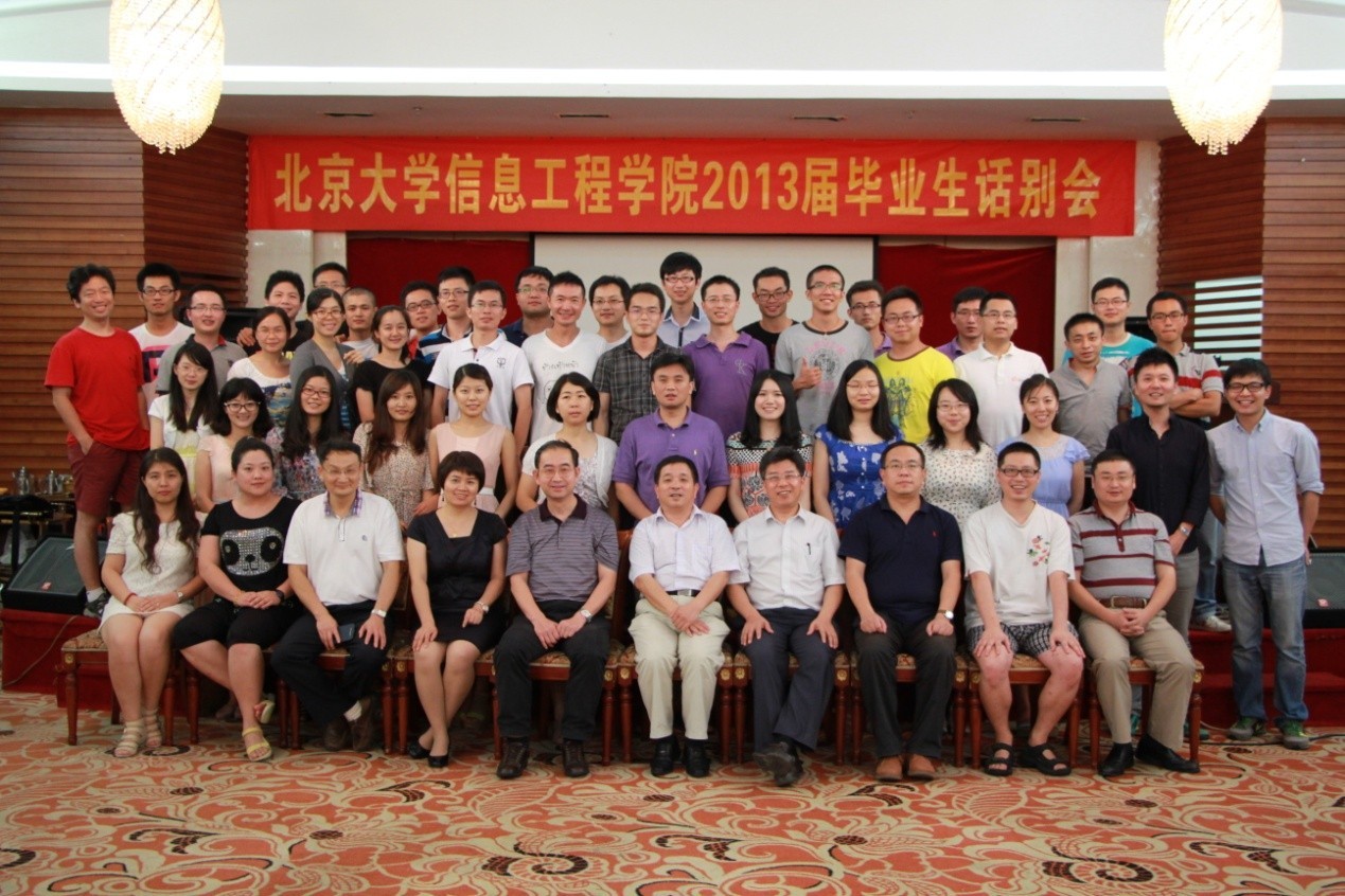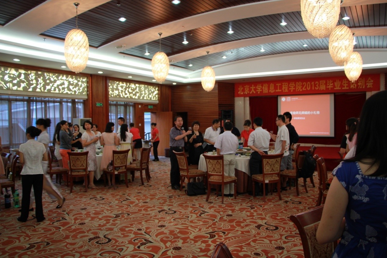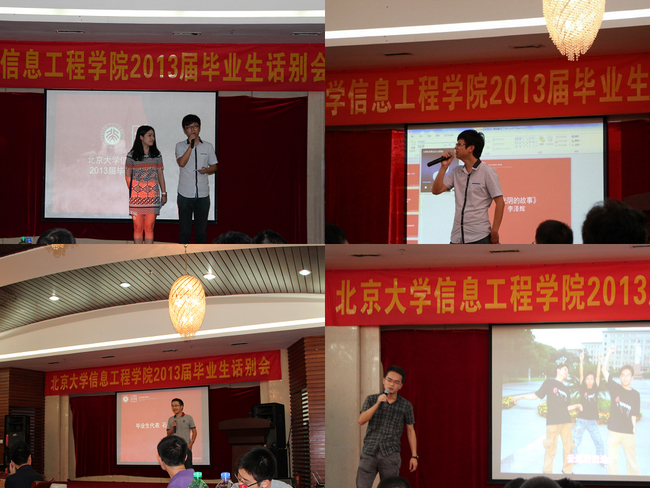 研究生会奉上的一段视频,勾起了毕业生们对这三年南燕生活点点滴滴的回忆,追忆很不舍,但却隔离不住时间的滴答声,一张张灿烂的笑容、一次次精彩的征程,原来美好的青春还在。话别会中,不仅有李泽辉、沈劲鹏、张文娟等应届毕业生的深情献唱,师生之间还进行了筷子夹乒乓球、你比划我猜等经典游戏,将老师和学生之间的感情再次拉近,使得话别会活跃着一股温情与快乐的氛围。话别会尾声,毕业生们纷纷向老师们举杯致敬,感恩三年来老师的孜孜教诲,老师们也希望毕业生在未来能够肩负北大人应有的社会责任,为国家的IT产业作出贡献。最后,话别会在全体师生大合照的定格声中圆满结束。