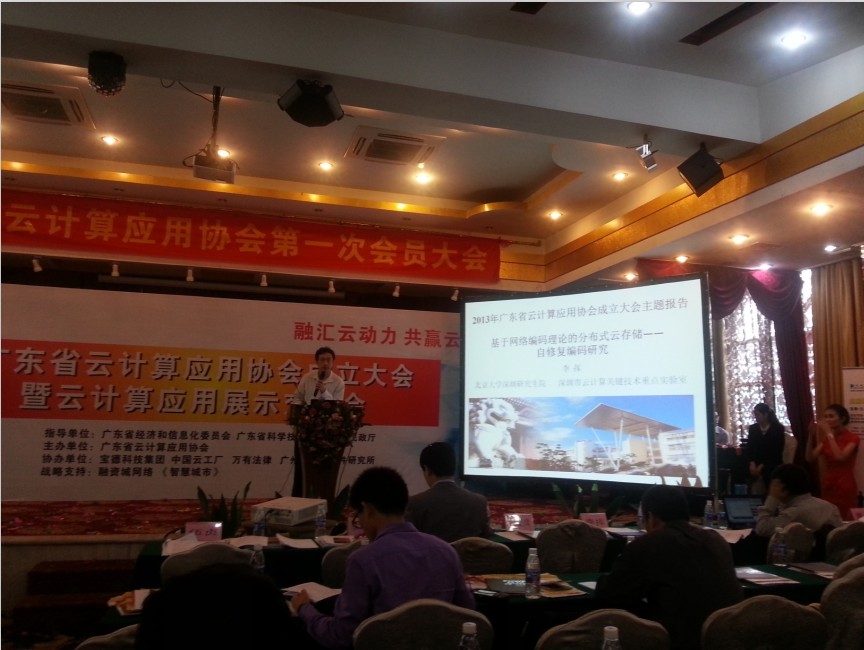 2013年4月19日下午,广东省云计算应用协会主办的“广东省云计算应用协会成立大会暨云计算应用展示交流会”在广州天河隆重召开,High漫李挥教授应邀参加本次大会,成为广东省云计算应用协会的副理事长,并作“基于网络编码理论的分布式云存储——自修复编码研究及进展”主题报告,介绍了国内外分布式云存储编码理论研究进展,引起与会代表的广泛关注。