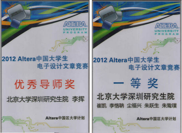 深圳市融合网络播控技术工程实验室和深圳市云计算关键技术和应用重点实验室崔凯、尘福兴、朱蛰璞等同学投稿的名为《一种基于分配格理论的大规模线速组播交换系统的设计》的论文,获得2012 Altera中国大学生电子设计文章竞赛九月月度奖,并在年度总评中获得年度一等奖(第1名)。