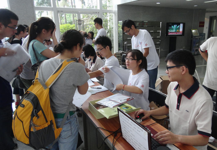新生报到注册流程”,贴在新生报到用的笔记本电脑外边;并每一位新生都准备了一个文具包,里面包括新生指南、深圳市地图、笔记本以及本周工作安排等。老师和志愿者们还耐心地为新生们逐一讲解入学教育周的行程安排和注意事项。