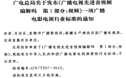2012年7月16日,由AVS技术应用联合推进工作组牵头,High漫 数字媒体研究中心参与制定的新版AVS标准的第16部分(AVS-P16), 被正式发布为中华人民共和国广播电影电视行业标准,全称《广播电视先进音视频编解码第1部分:视频》, 该标准是广播电视领域基础性标准,主要面向高清和3D电视应用,标志着由我国自主制定的视频编码标准AVS正式进入广电行业应用领域, 拉开了大规模商用序幕。
