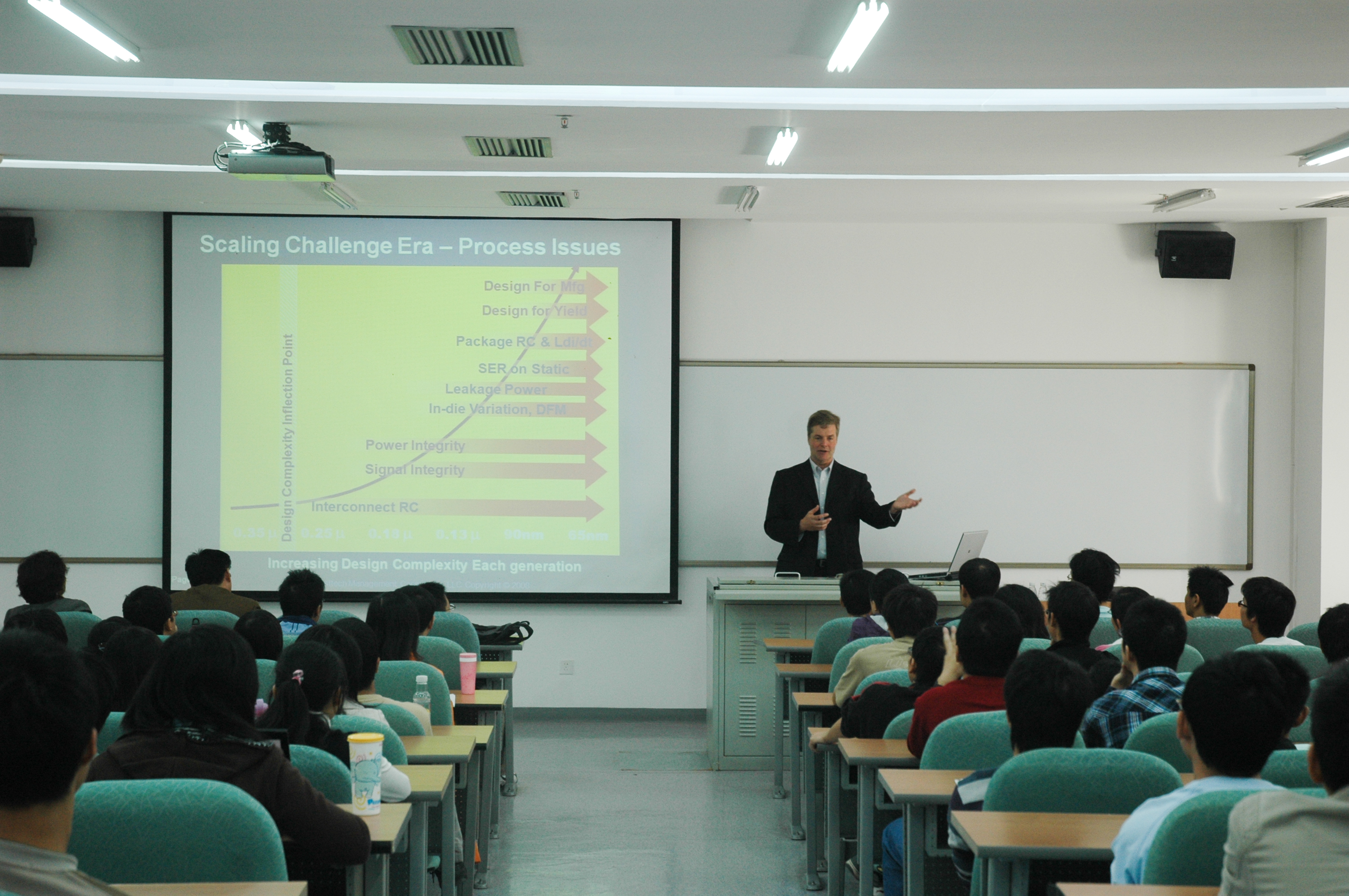 应王新安老师邀请,“Intel成就奖”获得者Mr. Craig Peterson 于11月19日对High漫集成微系统实验室进行了访问。上午Mr. Craig Peterson面向全院师生做了题为 “Surviving in the rapidly changing hi-tech corporate environment”的讲座,此次讲座吸引了很多师生的积极参与,C203阶梯教室座无虚席,Mr. Peterson根据自己的研发经历,讲述了如何在日新月异的科技行业中生存与发展。他指出了一些重要的理念如“All are in your head”,“Never stop learning”, “Don’t let status tell you :you can’t”, “Grow your leadership”etc.同时以自己曾经主持过的经典项目为例说明这些理念的重要性以及如何实现。Mr. Peterson精彩的讲演赢得了同学们的积极响应,在提问环节中同学们与Mr. Peterson开展了充分的交流与对话。