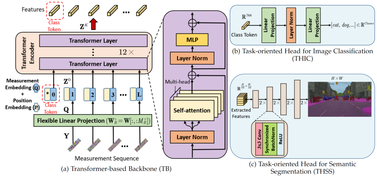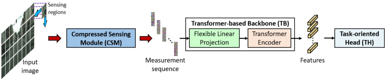 本文提出的压缩学习框架如图1所示,由一个压缩感知模块、一个骨干网络,和一个任务头构成。其中,压缩感知模块首先对场景图像进行块划分,然后对每个图像块进行压缩感知采样,输出一串感知序列。骨干网络采用了序列友好的Transformer结构,来进行特征提取。最后,由一个特定的任务头来执行图像推理任务。对应的网络结构如图2所示。