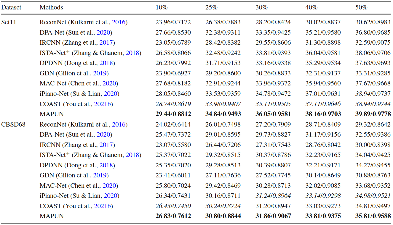结合以上设计,本文提出了记忆增强的深度展开网络(MAPUN),并且已在多个数据集上验证了MAPUN的性能最优。