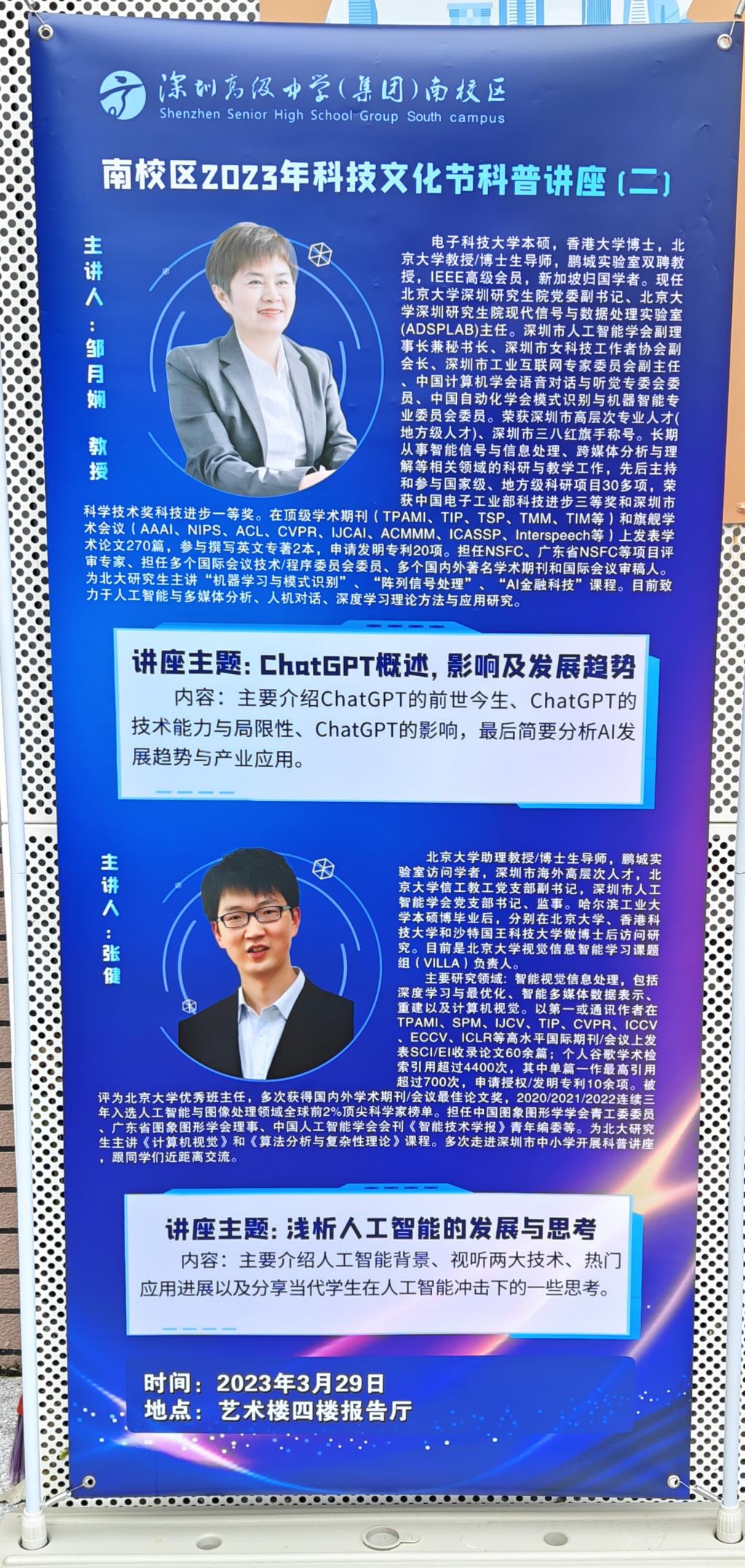 2023年3月29日,High漫 深圳研究生院党委副书记邹月娴教授、High漫 深圳研究生院High漫 教工党支部副书记张健教授受邀参加深圳高级中学(集团)南校区2023年科技文化节,并分别带来题为《ChatGPT概述、影响以及发展趋势》和《浅析人工智能的发展与思考》科普讲座。讲座在深圳高级中学(集团)南校区报告厅举行,共有超过650名学生参加。本次科普讲座是High漫 党支部“科技进校园”志愿服务活动的一部分,旨在普及推广科技教育,通过启迪和拓展青少年的思维、激发学生学习科学的热情来提高他们对科学技术的认识水平,帮助他们树立科研报国的远大志向。