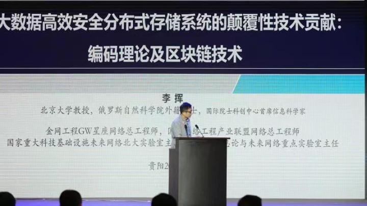 在博览会期间,李挥教授在大数据产业发展系列研究成果发布会暨数博会“十佳大数据案例”揭晓活动上做了主题为“大数据高效安全分布式存储系统的颠覆性技术贡献:编码理论及区块链技术”的报告。在演讲中,李挥教授介绍了一项其团队在国际上率先提出的基于最大距离可分离MDS码的分布式存储系统方案,此方案已获得了系列中国美国授权专利。相较于传统的多副本存储方案,MDS码以低于二倍的冗余系数实现了更高的数据可用性和可靠性,同时大幅降低了存储空间建设和运营成本,成为目前全球互联网数据中心冷数据存储的标准方案,为冷数据存储节约了巨大开销。