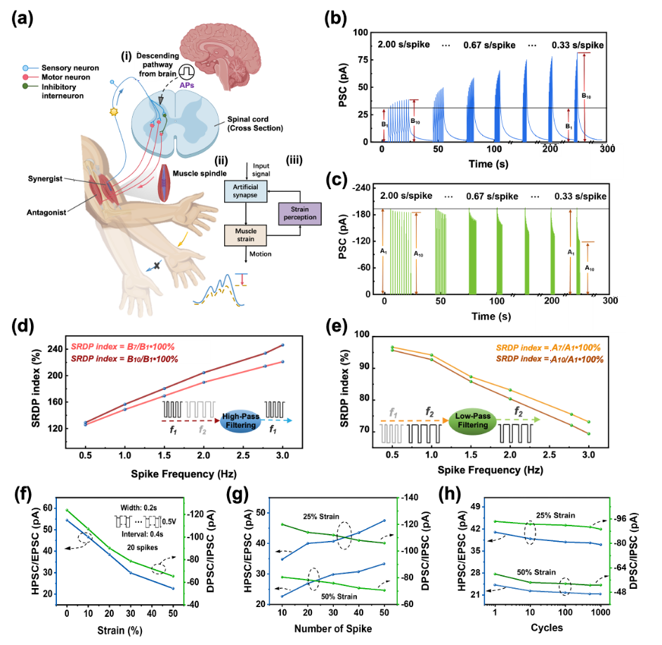 人工神经形态器件在神经逻辑和认知功能方面具有重要应用,可广泛应用于神经康复、人机交互和智能机器人等领域。赋予神经形态器件软性和可拉伸性的特性,使其能够适应各种不可预测的变形情况,还能够提高信号采集的准确性和佩戴的舒适性。然而,这些器件仍然容易受到严重的机械损伤(如穿刺、撕裂和切割),严重限制了它们在实际应用中的可靠性和寿命。因此,理想的可拉伸人工神经形态器件还应具备自愈能力,以在经历机械损伤后恢复其结构和性能。此外,在生物神经系统中,同一神经元的突触在相同刺激下可以表现出相反的可塑性形式,以支持一系列复杂神经功能。然而,目前可拉伸的神经形态器件仅能实现基本的单突触行为,无法满足复杂神经系统的需求。