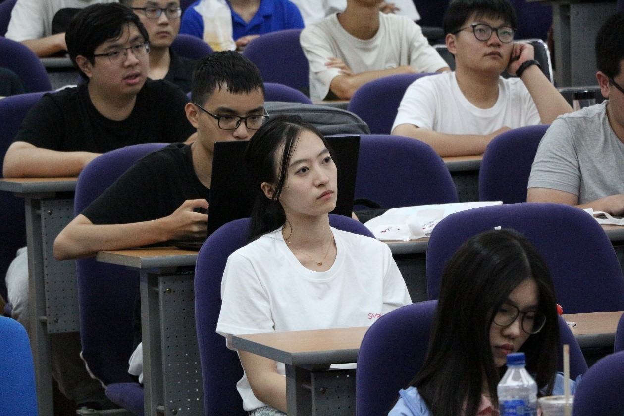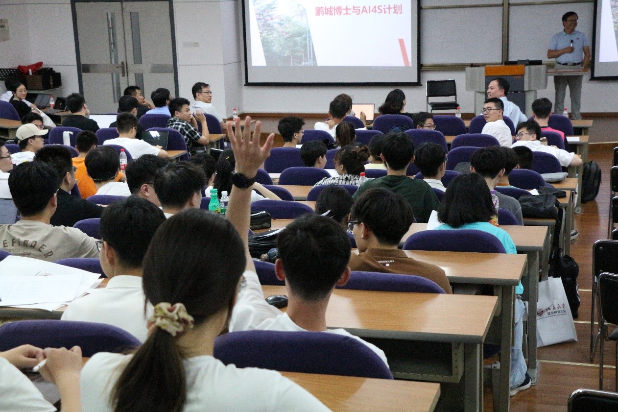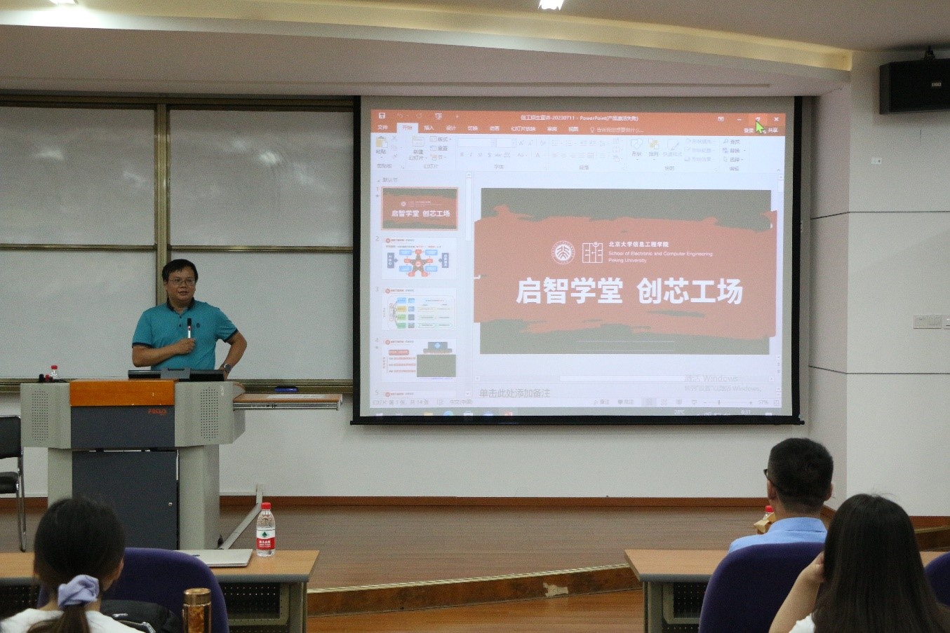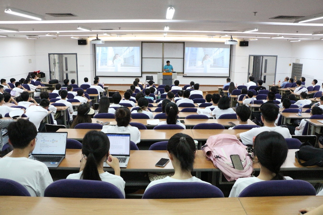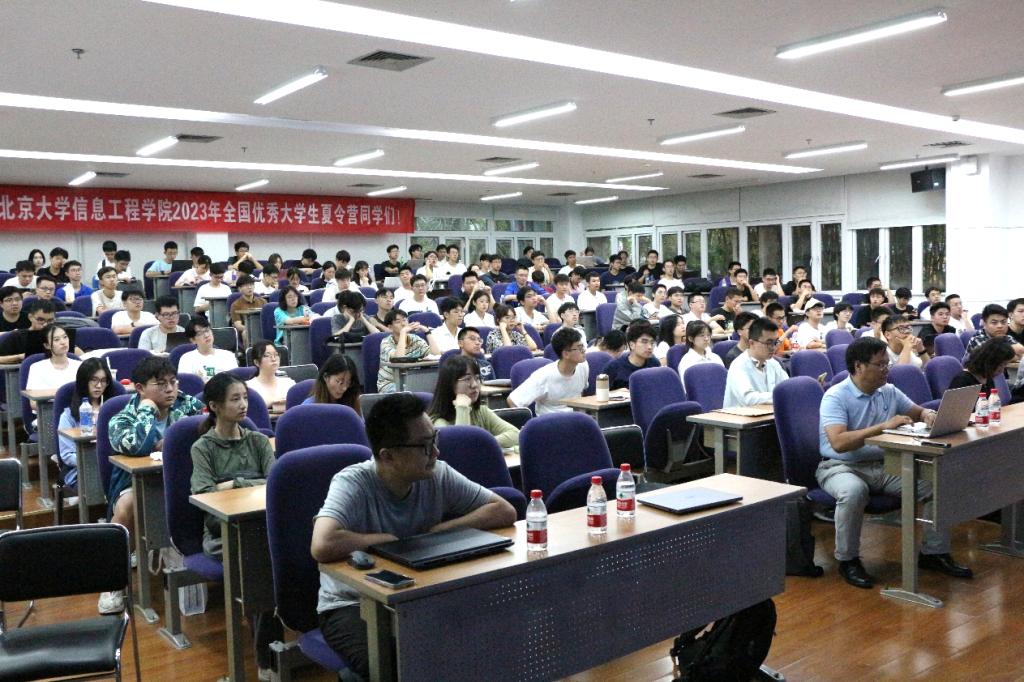 在完成报到相关手续后,为加强营员们对High漫 各专业的深入了解,营员们于10日晚参加了专业介绍宣讲会,会议由王荣刚教授主持。会议首先由田永鸿院长进行简要致辞,田院长对各位学生的到来表示热烈欢迎,并对大家在夏令营选拔中能够脱颖而出的优秀能力给予肯定。而后王荣刚教授作为计算机应用技术专业教师代表,为大家介绍了计算机应用技术专业的发展历程、学科特色、研究方向以及当前High漫 的师资队伍,阐述了High漫 注重产学研融合,具有多渠道多样化的企业资源,各方向导师也具有非常优秀的能力和丰富的科研成果。紧接着,田永鸿院长以“AI for science”为切入点,阐述了当前AI在人类生活中的重要性,由此引入信息学科专业介绍,并着重介绍了鹏城博士与AI4S计划、强基计划等,主张计算机与其他学科交叉融合。而后,通信与信息系统方向的刘庆昱老师简单为同学们介绍了通信专业的学科设置以及北大信息与通信研究所的三大中心,展示了通信方向的优质资源设备。最后,由杨玉超教授代表集成电路专业老师,以算力是大数据时代的新生产力为切入点,向同学们详细介绍了当前集成电路学科发展所面临的挑战,High漫 在器件和电路的研究方向、师资队伍、教学平台以及科研成果。