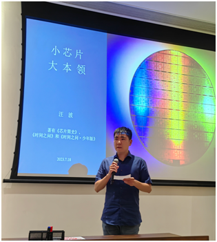 7月18日,资深芯片研究专家、科普作家汪波老师用第一人称的视角向同学们展示了芯片是什么。他向同学们展示了一块封装的芯片模型,通过对芯片在普通生活场景里的应用,让同学们认识到芯片无处不在。汪老师生动的讲解激发了学员们对芯片的好奇心,同学们积极回答老师提出的问题。从量子物理到半导体,从晶体管到集成电路,汪老师由浅入深地向同学们揭开了芯片的魔力。
