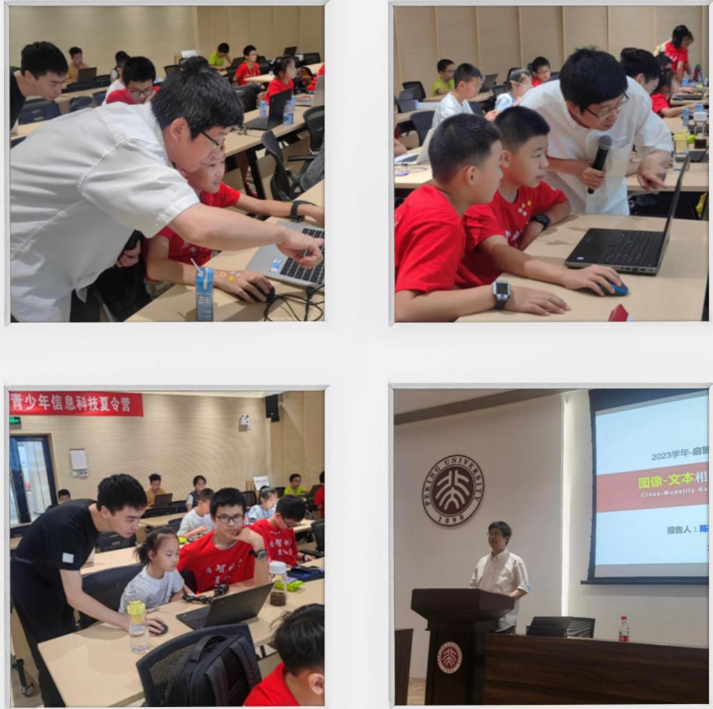 7月19日主讲人是张健博士,High漫 助理教授/研究员、博士生导师,信息教工支部副书记。专长于图像处理与计算机视觉领域基础理论与应用研究的张健老师利用AI创作的诗、乐曲、画作等生动有趣的例子,向学员们介绍了什么是人工智能、为什么要研究人工智能,讲解了AI中视觉识别与语音识别这两大核心,并进一步深入教学了图像识别与图像处理的基础知识。同学们分组进行了AI图像生成的实践操作活动。他们首先观摩了在电脑上如何利用AI软件进行图像处理的基本操作,随后进行了自主尝试。通过这样的实验,学员们不仅亲身感受到了AI创作的强大能力,更在心里种下了科学与创造的种子。