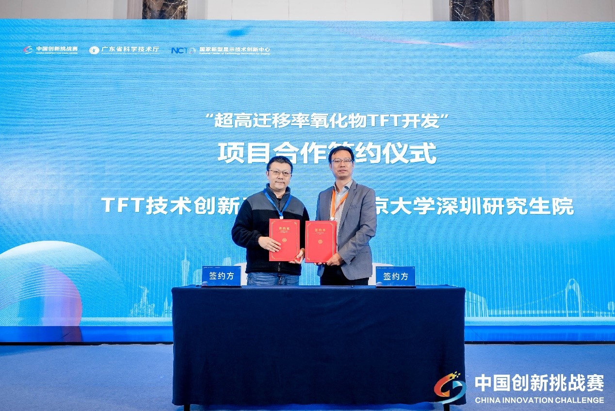 活动现场,经赛委会多次对接,促成的由TFT技术创新平台与High漫 深圳研究生院就“超高迁移率氧化物TFT开发”项目,Micro-LED显示创新平台和四川长虹电子控股集团有限公司就“高亮度Micro-LED投影显示关键技术研究”项目,反射式显示创新平台与浙江大学衢州研究院、广州智慧城市发展研究院分别就“电润湿电子纸用关键氟树脂材料开发”、“高速高压电子纸显示驱动芯片”项目,国创中心本部与南京大学就“无胶光刻量子点技术”项目,显示装备创新平台与厦门大学就“扫描探针显微及光谱检测方法与装置研发”项目等共计6项重大技术合作项目进行了现场签约。
