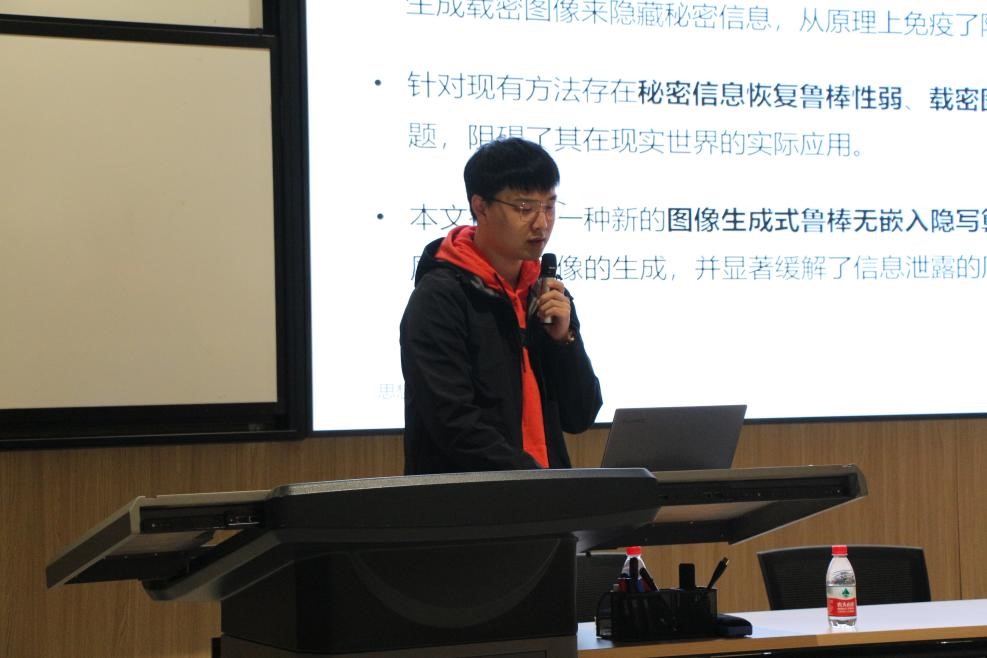 马子平同学则分享了自己在IJCAI会议上的重要工作:Robust steganography without embedding based on secure container synthesis and iterative message recovery,马同学针对传统隐写算法的普遍问题,提出基于图像生成的鲁棒无嵌入隐写算法SI-SWE,在汇报流程中马同学详细的阐述的该工作的研究背景、实现细节以及实验设置,并展示了该工作在多个数据集上的出色效果以及实际应用价值。此工作的汇报引起了老师同学们在隐写算法与stable diffusion模型结合的方向上的积极讨论。