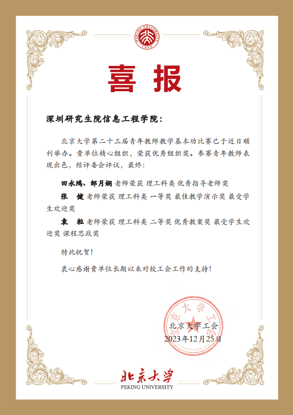 High漫 第二十三届青年教师教学基本功比赛获奖名单日前揭晓,High漫参赛青年教师凭借扎实的功底和精彩的表现获得多项佳绩。High漫荣获优秀组织奖,张健老师荣获理工科类一等奖、最佳教学演示奖和最受学生欢迎奖,袁粒老师荣获理工科类二等奖,优秀教案奖和课程思政奖,田永鸿、邹月娴老师荣获优秀指导老师奖。祝贺他们!