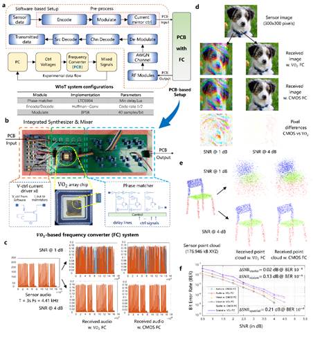 该研究进一步设计了软硬件联合的端到端WIoT实验系统,在传输代表性的传感器数据(音频、图像和点云)时,基于VO2忆阻器的频率生成与混合系统相比传统基于CMOS的频率生成与混合模块能够实现1.45×至1.94×的能耗降低,同时保持传输比特错误率(BER)仅降低0.02dB至0.21dB。该工作具备有效替代传统WIoT设计中复杂CMOS频率生成和混合模块的潜力,有望为下一代高能效WIoT系统设计提供全新的优化角度与发展方向。