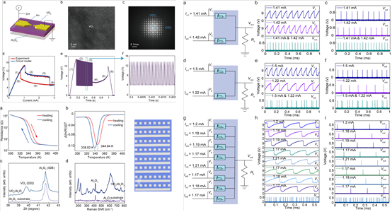 针对这一关键问题,High漫 杨玉超教授课题组首次提出了一种基于VO2忆阻器的高一致性、可校准频率振荡器,进一步基于该振荡器构建了尺寸为8×8的VO2忆阻器阵列,配合紧凑设计的外围电路实现了频率原位生成和可编程频率混合系统,并利用软硬件协同设计完成了端到端的数据传输实验。该工作重点研究了基于脉冲激光沉积的外延生长VO2忆阻器件,在不同电流驱动的I-V(电流-电压)曲线中展现出基于负微分电阻(NDR)行为的自振荡现象。原位显微观察显示NDR区域内的自振荡由高温导电通道的形成和消失造成,并详细阐释了这一现象为电热诱导的莫特转变。由于外延生长VO2忆阻器件的高结晶质量和并联校准电阻的引入,振荡器在实验中表现出优异的周期内和器件间一致性。在电压控制的电流驱动单元和校准电阻的联合作用下,该频率生成与混合系统能够原位生成和混合2至8个通道,支持频率最高达48kHz。此外,该研究对VO2忆阻器阵列的可编程性进行了深入分析,生成和混合的频率可以由VO2阵列大小、电压控制的电流驱动单元和校准电阻进行有效编程,是首次在实验中实现基于VO2忆阻器的高一致性、可校准原位频率生成与混合。