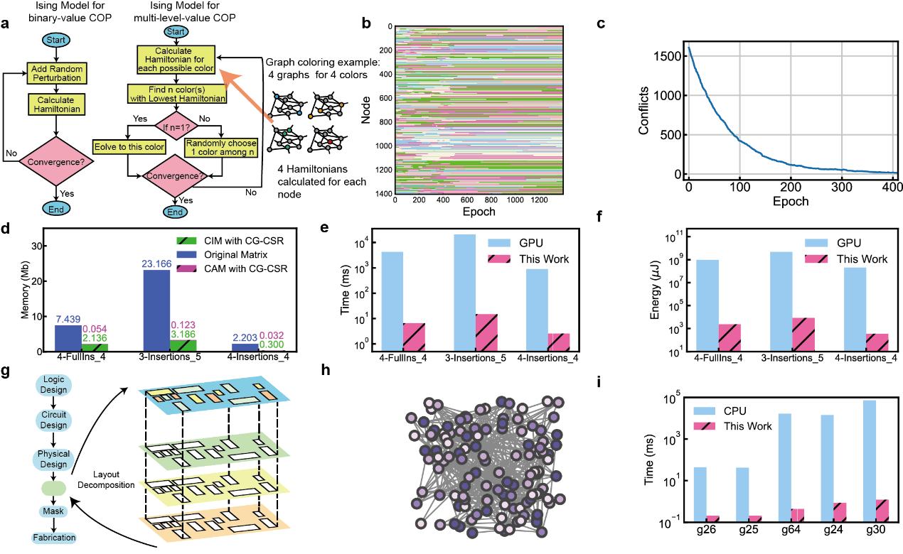 该工作首次实现了能够处理任意伊辛图结构的通用伊辛机。当问题规模增大时,其硬件开销也显著低于已有工作。基于此技术,本工作成功将伊辛机应用于求解实际的电子自动化设计(EDA)问题。在版图光罩划分问题中,相比于在CPU上运行的整数规划算法可以实现90–65,550倍的加速。这一功能的实现展示了通用伊辛机更高效应用于实际问题求解的潜力。