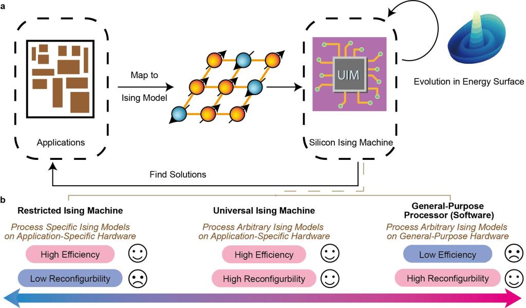 图1: 通用伊辛机的运行范式展现出高能效与高可重构性的特点