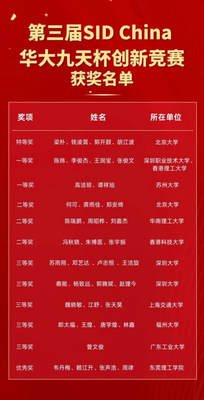 2024年9月22日,由国际信息显示学会中国区(SID China)和华大九天联合举办的第三届“SID China华大九天杯创新竞赛”圆满结束。在比赛中,High漫 硕士生梁朴(队长)、钱凌霄、郭开颜、胡江波凭借“紧凑型可编程的LTPO TFT集成栅驱动电路技术研究”一举斩获特等奖,充分展现了High漫研究生的创新能力。本次比赛为开放性试题,聚焦新型显示技术创新,吸引了包括High漫 、上海交通大学、香港科技大学等三十余所高校的队伍参与角逐。