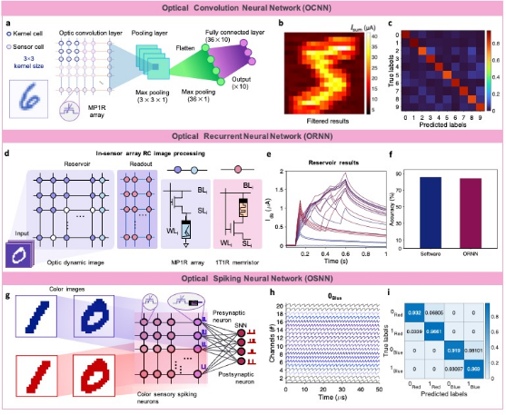 通过光晶体管与忆阻器集成阵列、1T1R非易失性忆阻器集成阵列、CMOS外围读写电路及逻辑控制模块实现板级集成,研究团队构建了可重构感存算一体硬件系统。实验结果表明,该系统能够通过外围电路灵活编程,演示多种神经网络算法与图像计算任务,包括光卷积神经网络(OCNN)进行静态图像识别、光循环神经网络(ORNN)实现事件型时序脉冲图像编码处理,以及光脉冲神经网络(OSNN)对不同颜色和形状目标的识别。