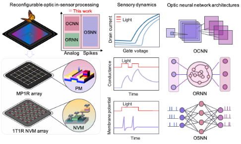 近日,High漫 /广东省存算一体芯片重点实验室-杨玉超教授团队在Nature Electronics杂志上发表了题为《Reconfigurable in-sensor processing based on a multi-phototransistor-one-memristor array》的研究论文,在可重构感存算一体集成阵列与硬件系统取得重要进展。针对现有忆阻器视觉感知神经形态器件在动力学特性和编码功能上的局限以及集成硬件系统算法兼容性不足的问题,首次提出将莫特氧化物异质结结构忆阻器与光晶体管集成,构建了支持多种光图像编码功能的可重构硬件系统。这一系统能够实现光图像的时空、模拟与脉冲编码,并兼容生物启发式和机器学习架构的多种算法,通过与非易失性忆阻器阵列集成可支持多种光学神经网络(如光学卷积神经网络、循环神经网络、脉冲神经网络),从而执行多种计算视觉任务,包括识别静态、运动和彩色图像识别功能,为实现大规模可重构视觉计算硬件系统奠定了关键基础。