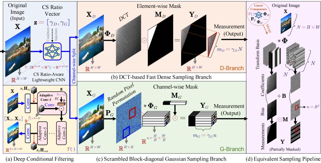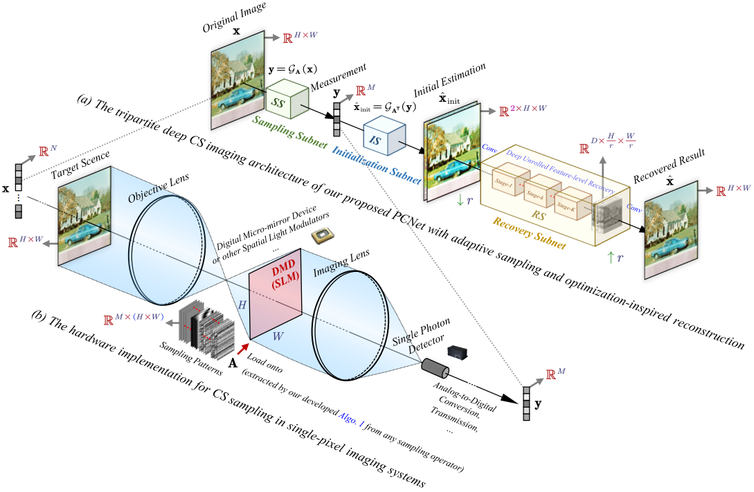 图像压缩感知(Compressed Sensing,CS)旨在从少量线性观测值中重建原始图像信号,以突破奈奎斯特采样极限、极大地降低信号获取成本,其应用包括但不限于单像素相机、医疗成像(如CT和MRI)以及视频快照和光谱压缩成像等。目前,CS面临两个具有挑战性的问题:(1)如何设计高效的采样矩阵和采样方式,以尽可能多地保留图像信息;(2)如何设计高效的重建算法,以快速、精确地复原图像信号。课题组针对这两个问题,提出一种实用的紧凑深度压缩感知算法,相关成果发表在TPAMI上(论文地址:)。
