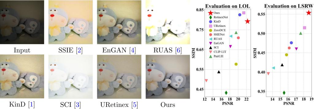 得益于各模块间良好的兼容性,课题组提出了一个实用、高效的低光照图像增强神经网络,可应用于真实场景多变的低光退化。该方法在多个图像基准数据集上均取得了领先的性能。
