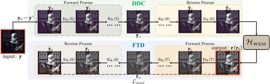 另一方面,如图4所示,对于低光照增强模型增强后的结果,课题组采用了知识蒸馏的策略,引入细粒度目标域蒸馏操作(Fine-grained Target Domain Distillation, FTD),通过将增强结果再次使用DDPM的加噪-去噪采样进行细粒度优化,进一步提升增强图像的质量。在真实世界捕获的低光照图像上,FTD展现出了显著的性能提升和鲁棒性。