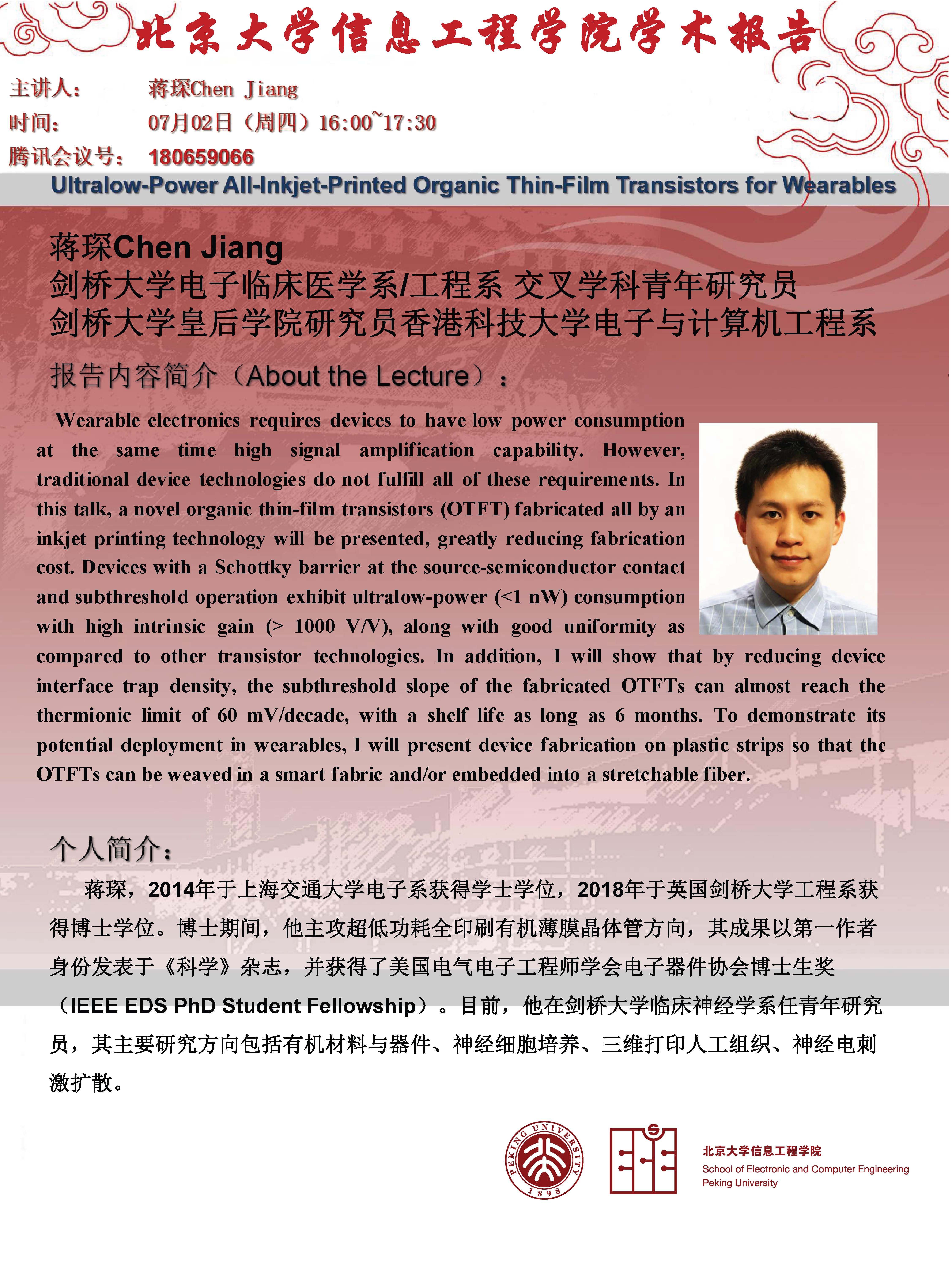 【学术讲座】蒋琛博士(剑桥大学):Ultralow-Power All-Inkjet-Printed Organic Thin-Film Transistors for Wearables