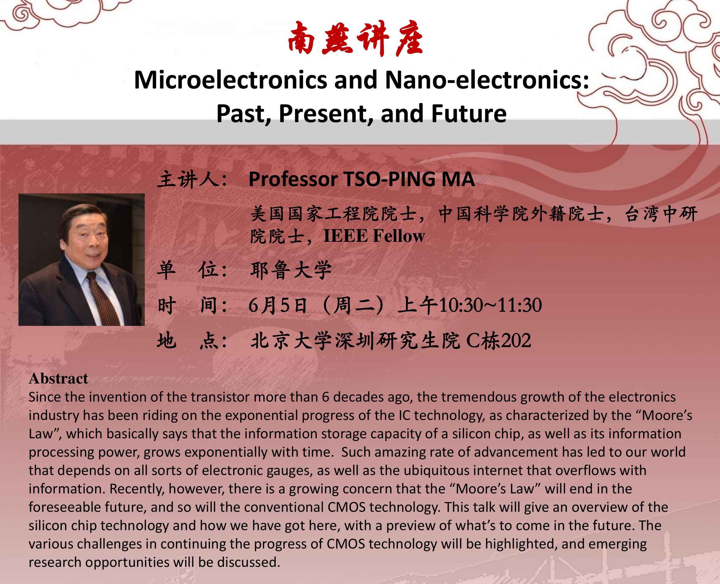 【学术讲座】Professor TSO-PING MA(耶鲁大学)Microelectronics and Nano-electronics: Past, Present, and Future
