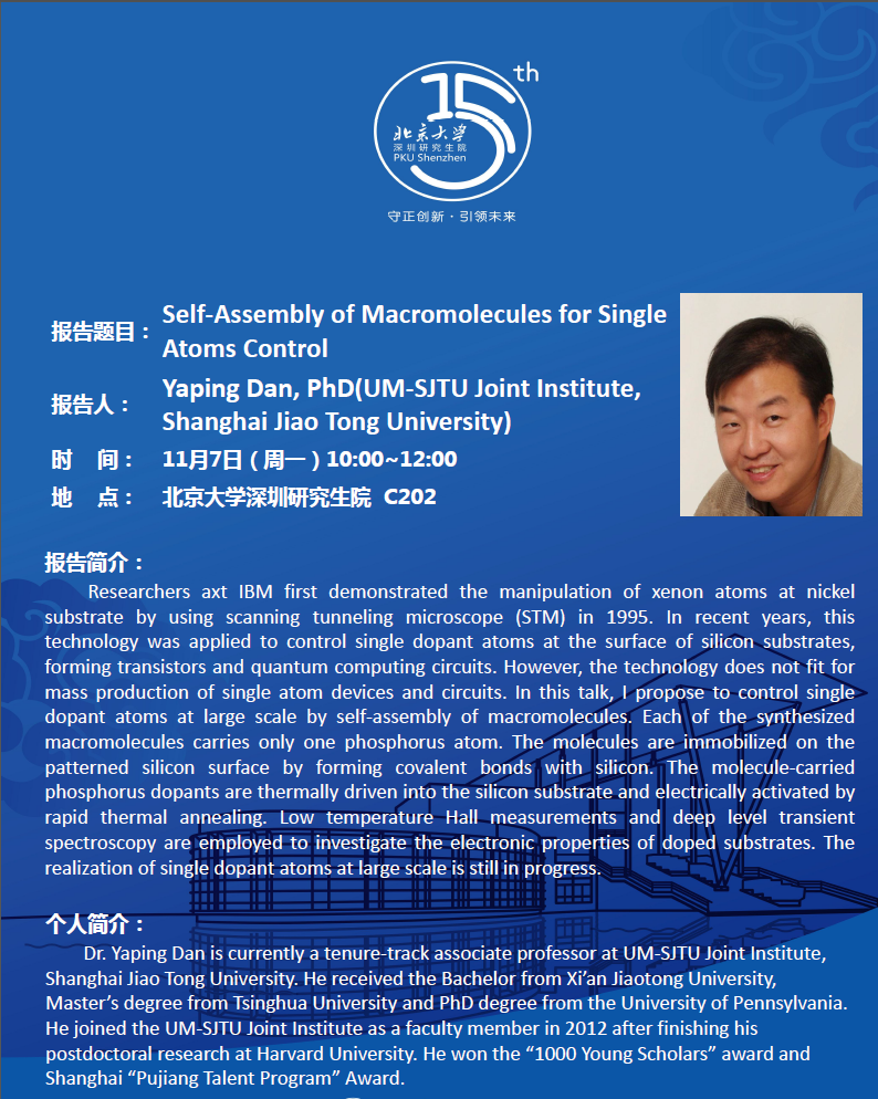 【学术讲座】Yaping Dan, PhD(UM-SJTU Joint Institute):Self-Assembly of Macromolecules for Single Atoms Control