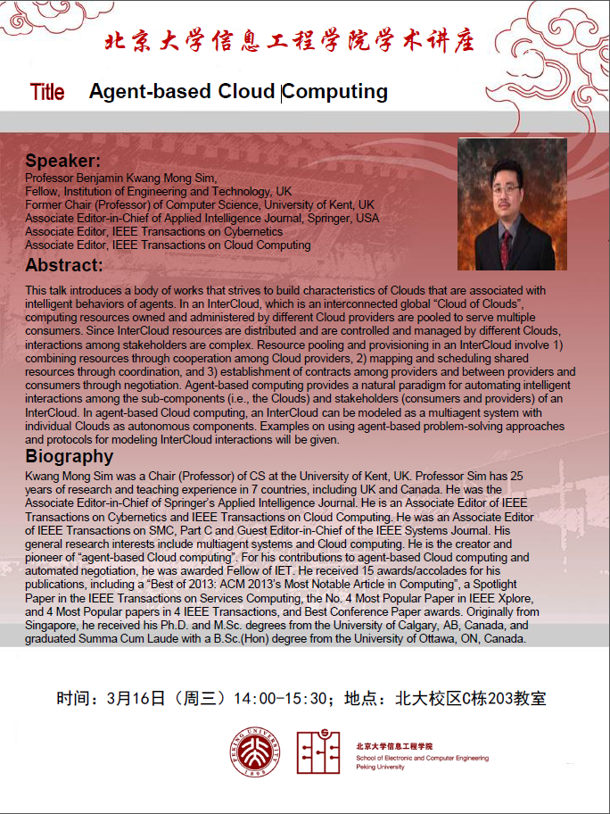 【学术讲座】Prof.Benjamin Kwang Mong Sim: Agent-based Cloud Computing