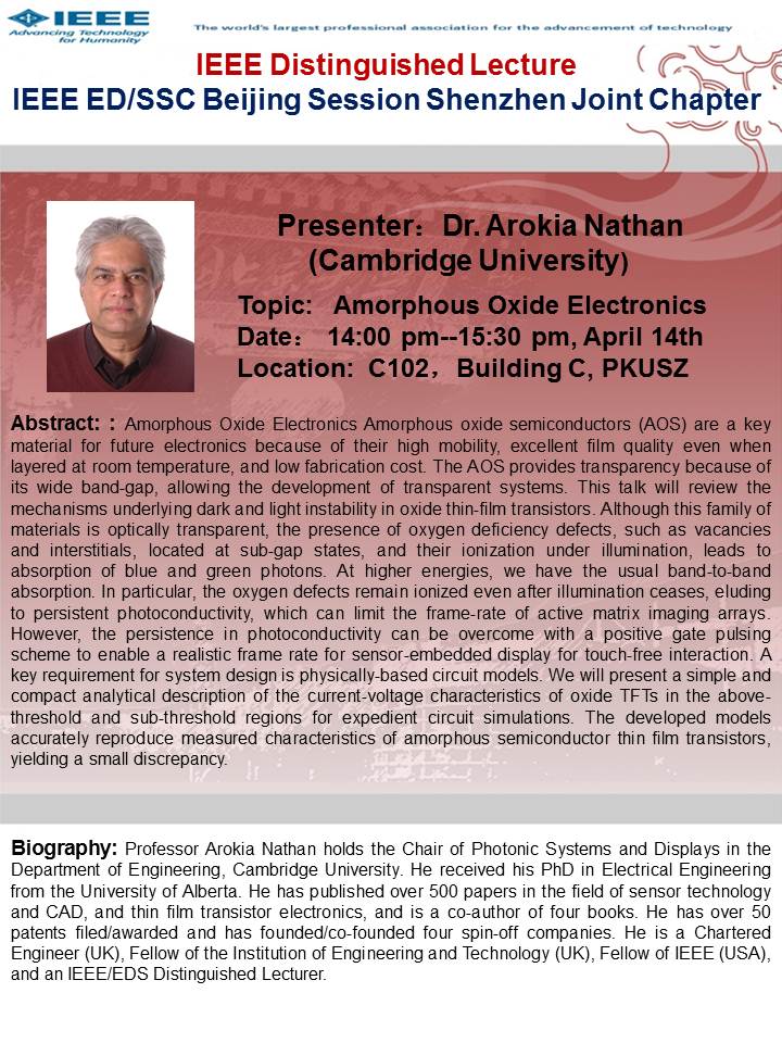 【学术讲座】Dr. Arokia Nathan(Cambridge University):Amorphous Oxide Electronics