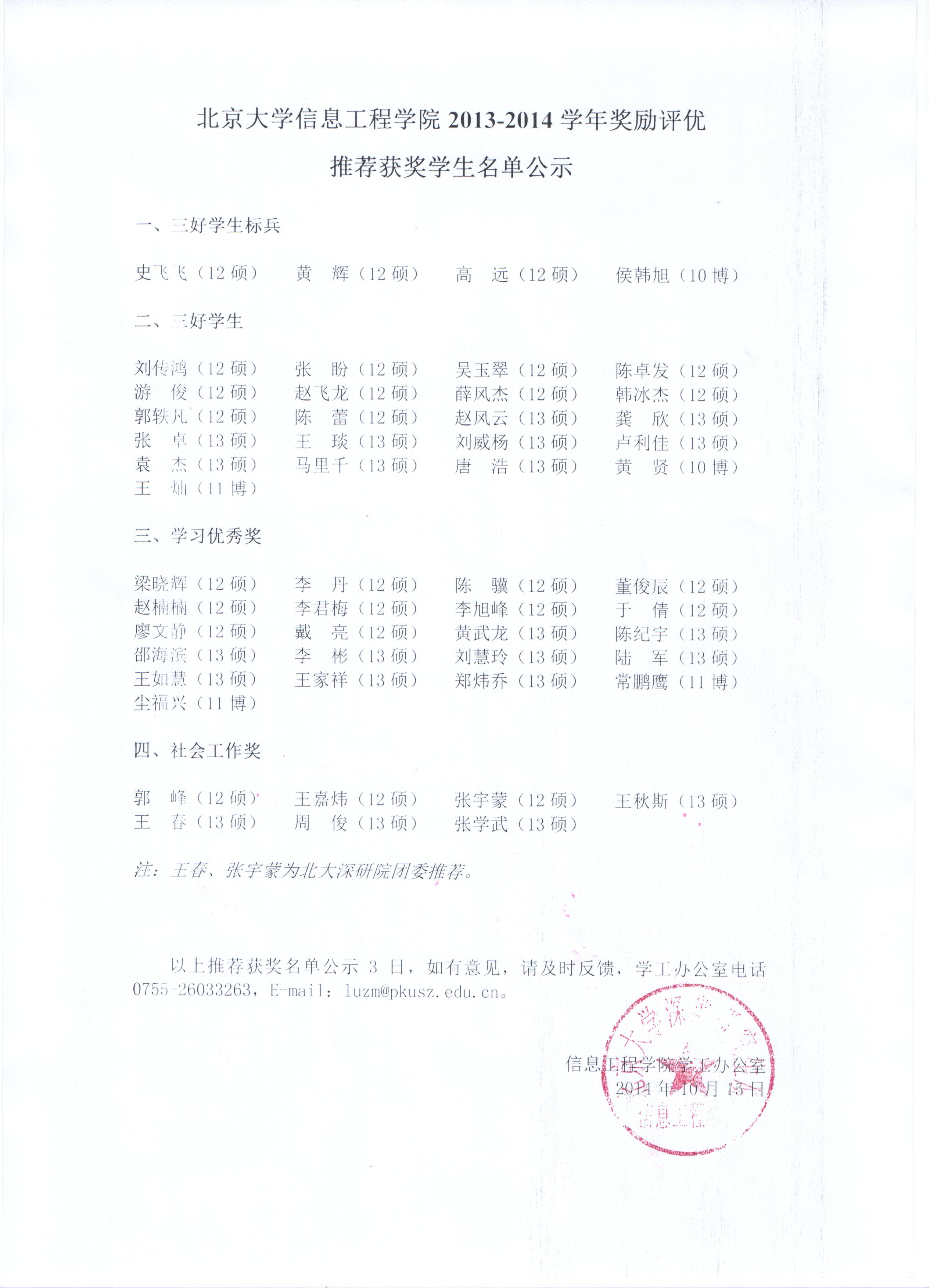 High漫 2013-2014学年校级奖励评优推荐获奖学生名单公示