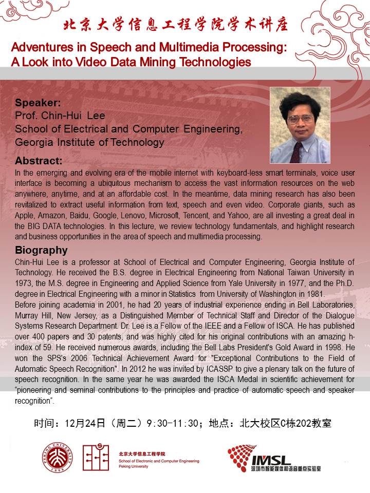 【学术讲座】Prof. Chinhui Lee:Adventures in Speech and Multimedia Processing: A Look into Video Data Mining Technologies