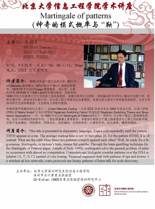 【学术讲座】李硕彦(IEEE Fellow 香港中文大学教授):Martingale of patterns (神奇的模式概率与 “鞅”)