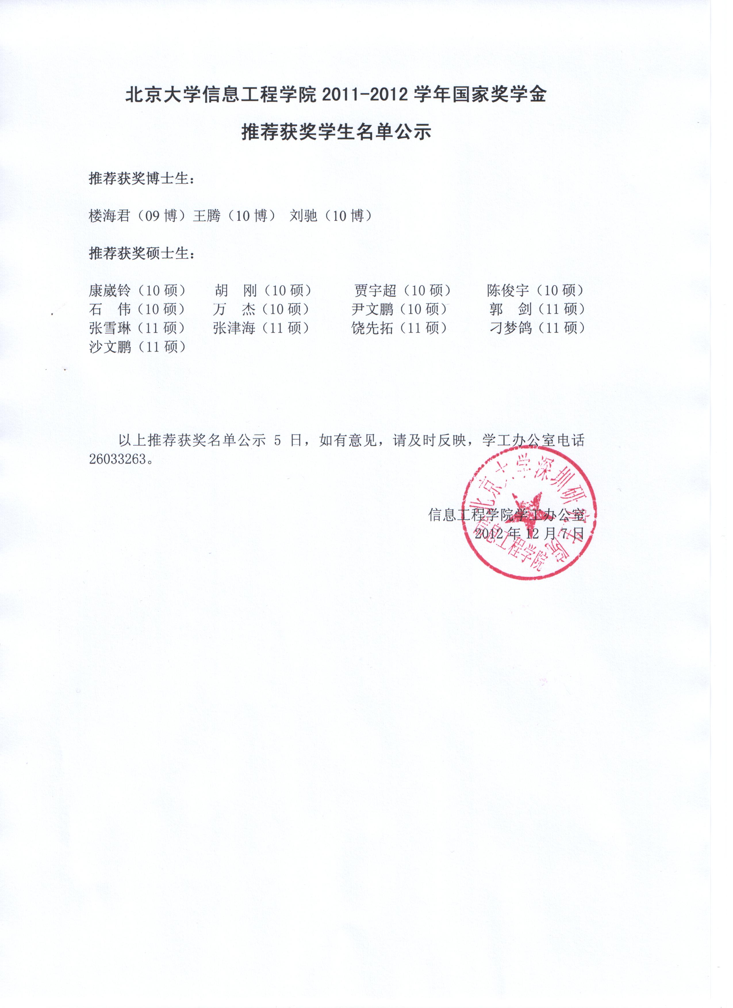 High漫 2011—2012学年国家奖学金推荐获奖名单公示