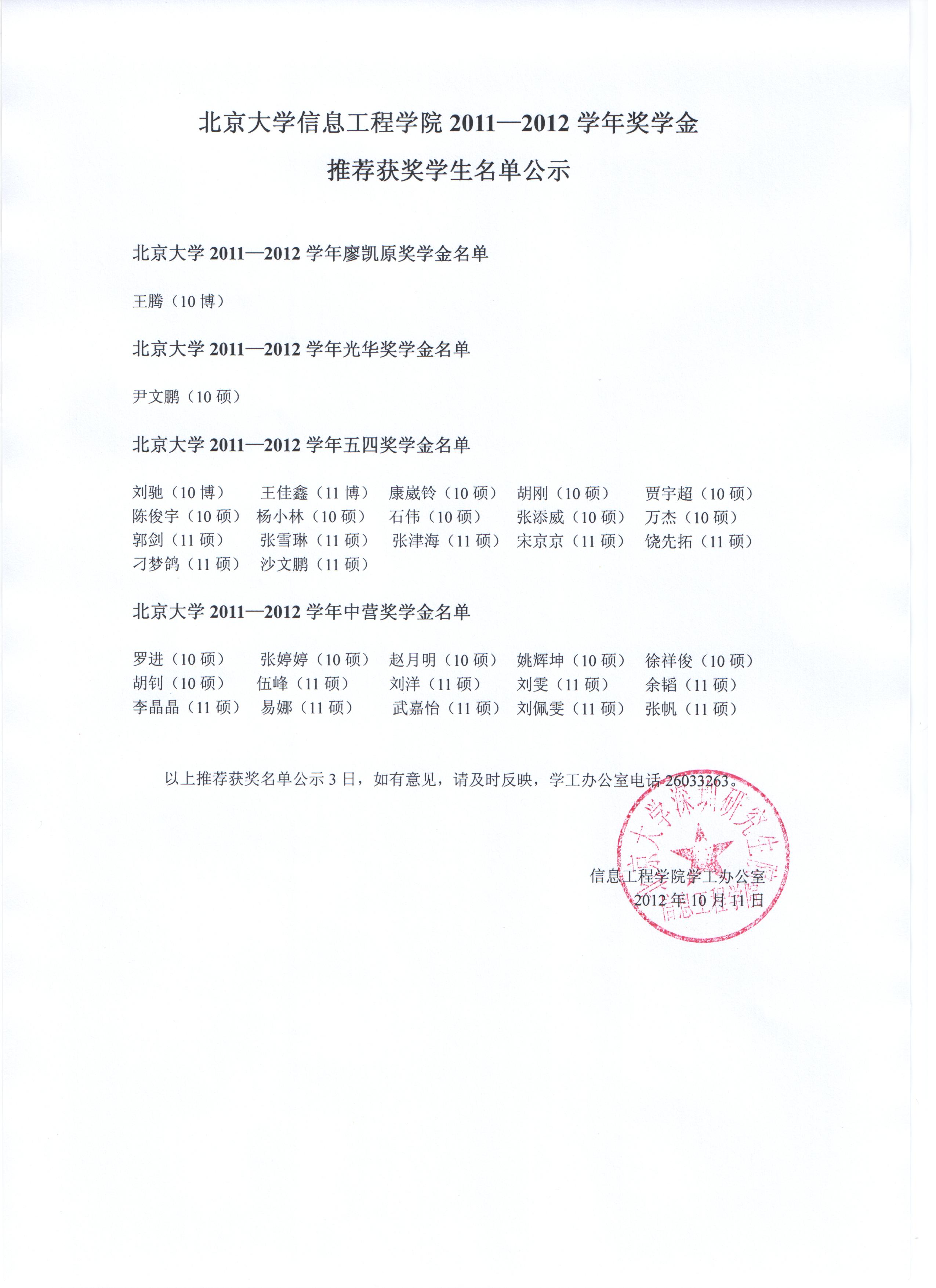 High漫 2011—2012学年奖学金推荐获奖学生名单公示